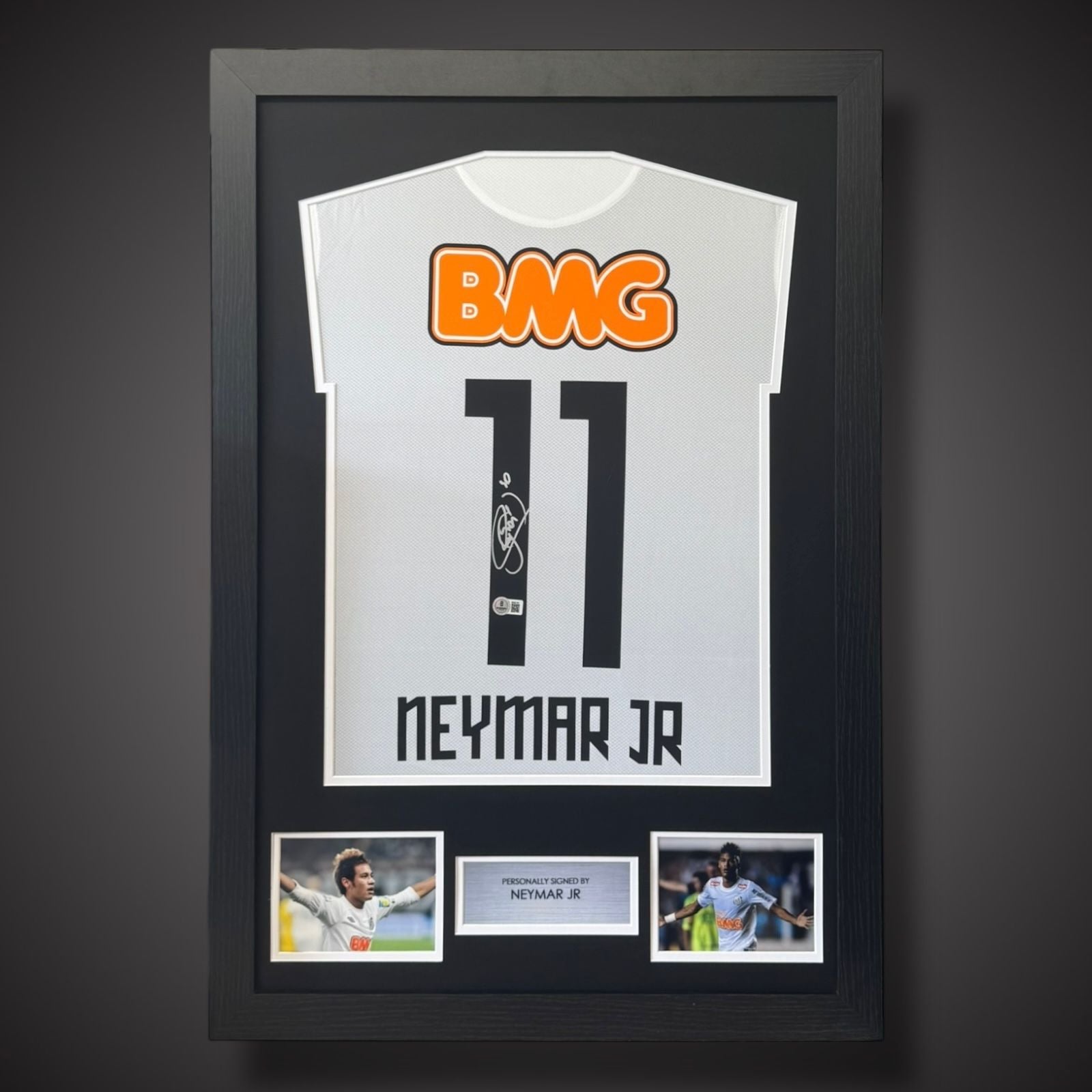 The product is a hand signed Santos FC framed football shirt by Neymar Jr, accompanied by a Certificate of Authenticity (COA). This collectible item would be a prized possession for any football fan or collector looking to add a unique and valuable piece to their collection.
