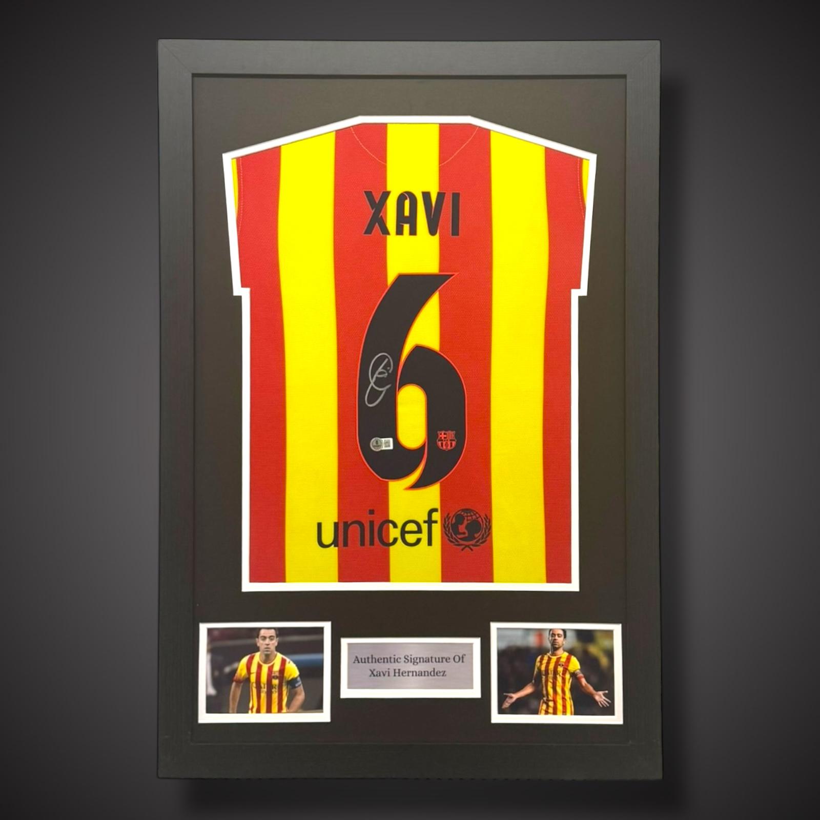 This product is a framed Barcelona football shirt personally signed by Xavi Hernandez, a legendary football player....